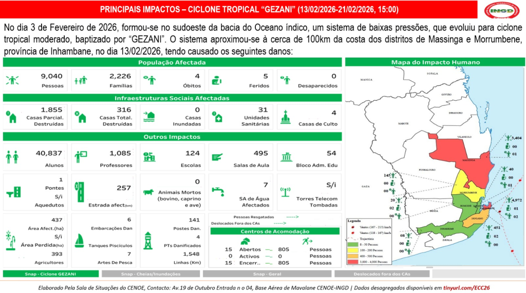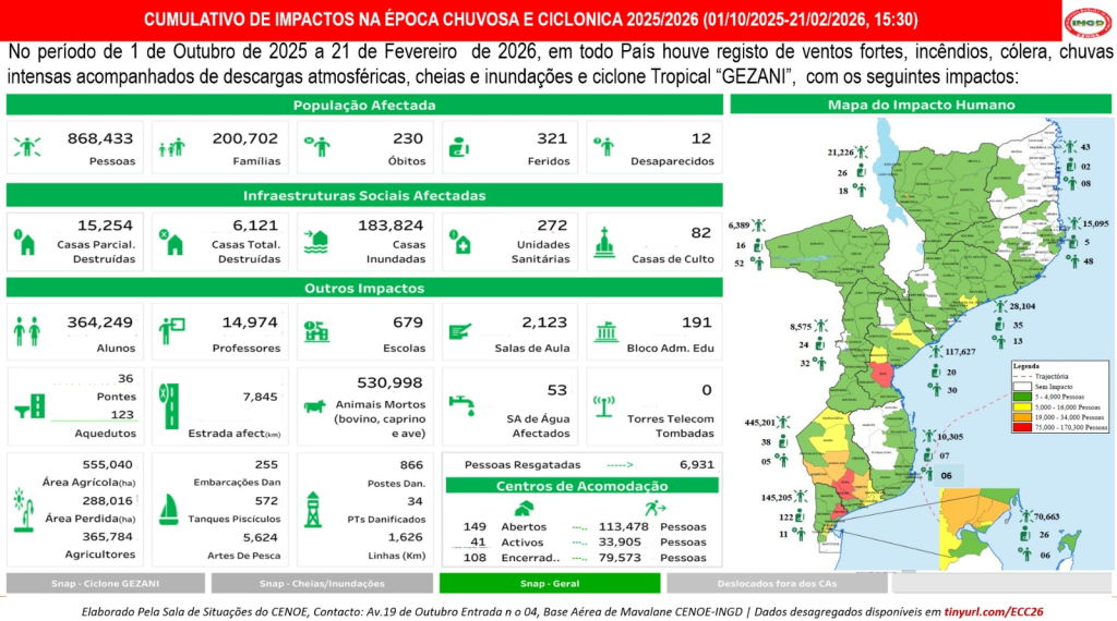 Dados dos impactos da Época chuvosa e Ciclónica 2025/2026 (Cumulativo&Ciclone Gezani) 21 de Fevereiro, 2026 19:50 Dados até 21.02.2026 « PreviousNext » Leave a Reply Clique aqui para cancelar a resposta. Δ