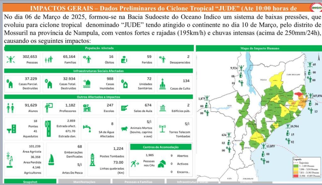 O ciclone Jude, que se formou na Bacia Sudoeste do Oceano Índico no dia 6 de Março, atingiu o continente pelo distrito de Mossuril, na província de Nampula, com ventos de até 195 km/h e chuvas intensas acima de 250 mm em 24 horas. A rápida intervenção do INGD tem sido crucial para garantir assistência humanitária imediata, incluindo a distribuição de alimentos, água potável e kits de emergência às populações afectadas.